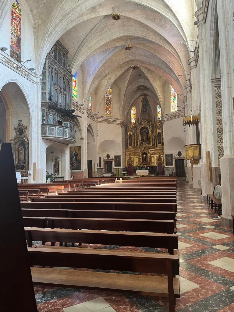 We rented bikes after our ride to go to Felanitx. The millions of European tourists who were at the airport yesterday didn’t join us here because it’s not close to a beach and it is el infierno temperature and humidity wise. My number 1 purchase here will be all the water. The island can’t keep up with Izzy and my demands for hydration. I’m loving the sleepy town with its spectacular church. The church had all the gold work, sculptures, tiles and paintings we loved in Portugal with the little idiosyncratic touches that are my favorite. In Portugal it was the less talented artist Marty who couldn’t paint or sculpt animals or people mixed with great intricate talent. In Sant Michael, the stained glass was primarily done by masters except that one summer where I imagine they had the really popular “bring your kid to work” week back in the 70s. Let’s just say a few of the stained glass should probably be tacked to my fridge.